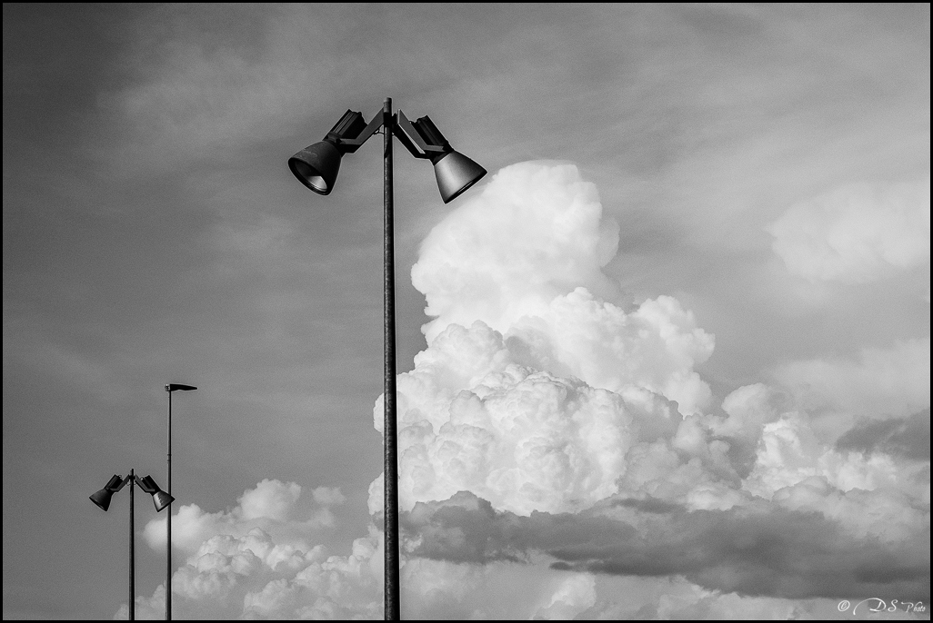 Soudain je réalise que, de par leur forme et leur position, ils pourraient tout à fait être intégrés à la composition et raconter une histoire. Je reviens sur mes pas, slalomant entre les voitures, pour trouver l’angle qui va me permettre de raconter l’histoire en question. Clic- C’est dans la boîte, et voilà capturés pour l’éternité mes souffleurs de nuages, pour ceux qui ne savaient pas comment c’était fait, un nuage.